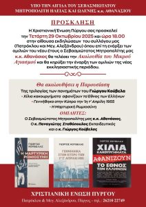 Αγιασμός από τον Ιεράρχη της Ηλείας Σεβ. Μητροπολίτη κ. Αθανάσιο για τη νεα χρονιά ομιλιών και παρουσίαση τριλογίας βιβλίων του καταγόμενου από τον Πύργο έγκριτου Δικηγόρου Γιώργου Κούβελα
