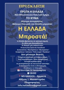 Σε μια περίοδο έντονων κοινωνικών και θεσμικών προκλήσεων, το «ΠΡΩΤΑ Η ΕΛΛΑΔΑ Νέο Εθνικά Ενιαίο Πολιτικό Σχήμα» και το «ΚΥΜΑ», παίρνουν πρωτοβουλία και απευθύνουν ανοιχτό κάλεσμα συμμετοχής και συνεργασίας προς όλους τους πολίτες.