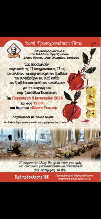 Δηλώστε συμμετοχή το αργότερο σήμερα Πέμπτη 8 του Γενάρη για την μεγάλη εκδήλωση της πρωτοχρονιάτικης πίτας του δραστήριου Συλλόγου Εργαζομένων στους