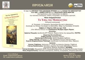 ΔΙΑΚΟΣΙΑ ΧΡΟΝΙΑ ΑΠΟ ΤΗΝ ΕΞΟΔΟ ΤΟΥ ΜΕΣΟΛΟΓΓΊΟΥ *** Ο ΔΗΜΟΣ ΠΥΡΓΟΥ ΚΑΙ Ο ΕΚΔΟΤΙΚΟΣ ΟΙΚΟΣ *ΒΕΡΓΙΝΑ* ΤΙΜΩΝΤΑΣ ΤΗΝ ΙΣΤΟΡΙΚΗ ΚΑΙ ΜΕΓΑΛΕΙΩΔΗ ΣΕ ΕΥΨΥΧΙΑ ΚΑΙ ΠΑΤΡΙΩΤΙΣΜΟ ΕΠΕΤΕΙΟ ΔΙΟΡΓΑΝΩΝΟΥΝ ΤΗΝ ΠΑΡΟΥΣΙΑΣΗ ΤΟΥ ΒΙΒΛΙΟΥ *ΤΟ ΕΠΟΣ ΤΟΥ ΜΕΣΟΛΟΓΓΙΟΥ* ΠΟΥ ΑΠΟΤΕΛΕΙ ΜΙΑ ΣΗΜΑΝΤΙΚΗ ΚΑΤΑΓΡΑΦΗ ΤΟΥ ΣΥΜΠΑΤΡΙΩΤΗ ΣΥΓΓΡΑΦΕΑ ΚΑΙ ΙΣΤΟΡΙΚΟΥ ΕΡΕΥΝΗΤΗ ΝΙΚΟΥ ΑΣΗΜΑΚΟΠΟΥΛΟΥ