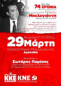 ΕΚΔΗΛΩΣΗ ΤΙΜΗΣ ΚΑΙ ΜΝΗΜΗΣ ΑΠΟ ΚΚΕ & ΚΝΕ ΓΙΑ ΤΟΝ ΔΙΚΟ ΜΑΣ ΝΙΚΟ ΜΠΕΛΟΓΙΑΝΝΗ ΤΗΣ ΗΛΕΙΑΣ ΓΕΝΝΗΜΑ ΚΑΙ ΤΗΣ ΕΛΛΑΔΑΣ ΦΩΣ ΤΗΝ ΚΥΡΙΑΚΗ 29 ΤΟΥ ΑΝΑΠΟΔΡΑΣΤΟΥ ΜΑΡΤΗ ΣΤΗΝ ΠΛΑΤΕΙΑ ΜΠΕΛΟΓΙΑΝΝΗ ΣΤΗΝ ΑΜΑΛΙΑΔΑ