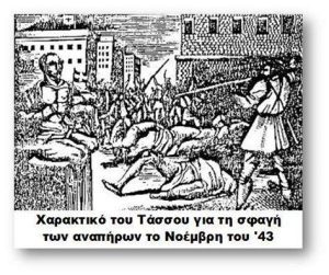 Αυτή η κατάχρηση εξουσίας έφτασε στο σημείο να βάλουν Έλληνες με την ευγενή στολή του Εύζωνα να πυροβολήσουν ανάπηρους από τα Αλβανικά βουνά, άνδρες με κομμένα πόδια, με παράλυση, και να εισβάλλουν στα νοσοκομεία των αναπήρων για να βγάλουν έξω ανθρώπους άρρωστους, ακρωτηριασμένους και με ανοιχτά τραύματα, να τους στριμώξουν γυμνούς στις φυλακές Χατζηκώστα και Χατζηκυριάκου…»