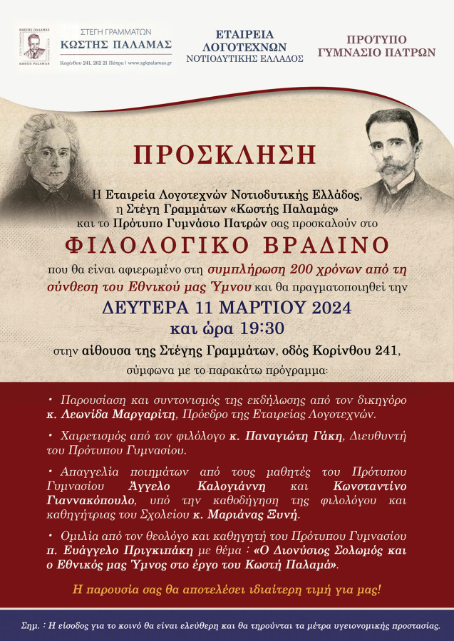 ΦΙΛΟΛΟΓΙΚΟ ΒΡΑΔΙΝΟ ΤΗ ΔΕΥΤΕΡΑ 11/3 ΣΤΗΝ ΠΑΤΡΑ ΓΙΑ ΤΑ 200 ΧΡΟΝΙΑ ΑΠΟ ΤΗ ΣΥΝΘΕΣΗ ΤΟΥ ΕΘΝΙΚΟΥ ΜΑΣ ΥΜΝΟΥ