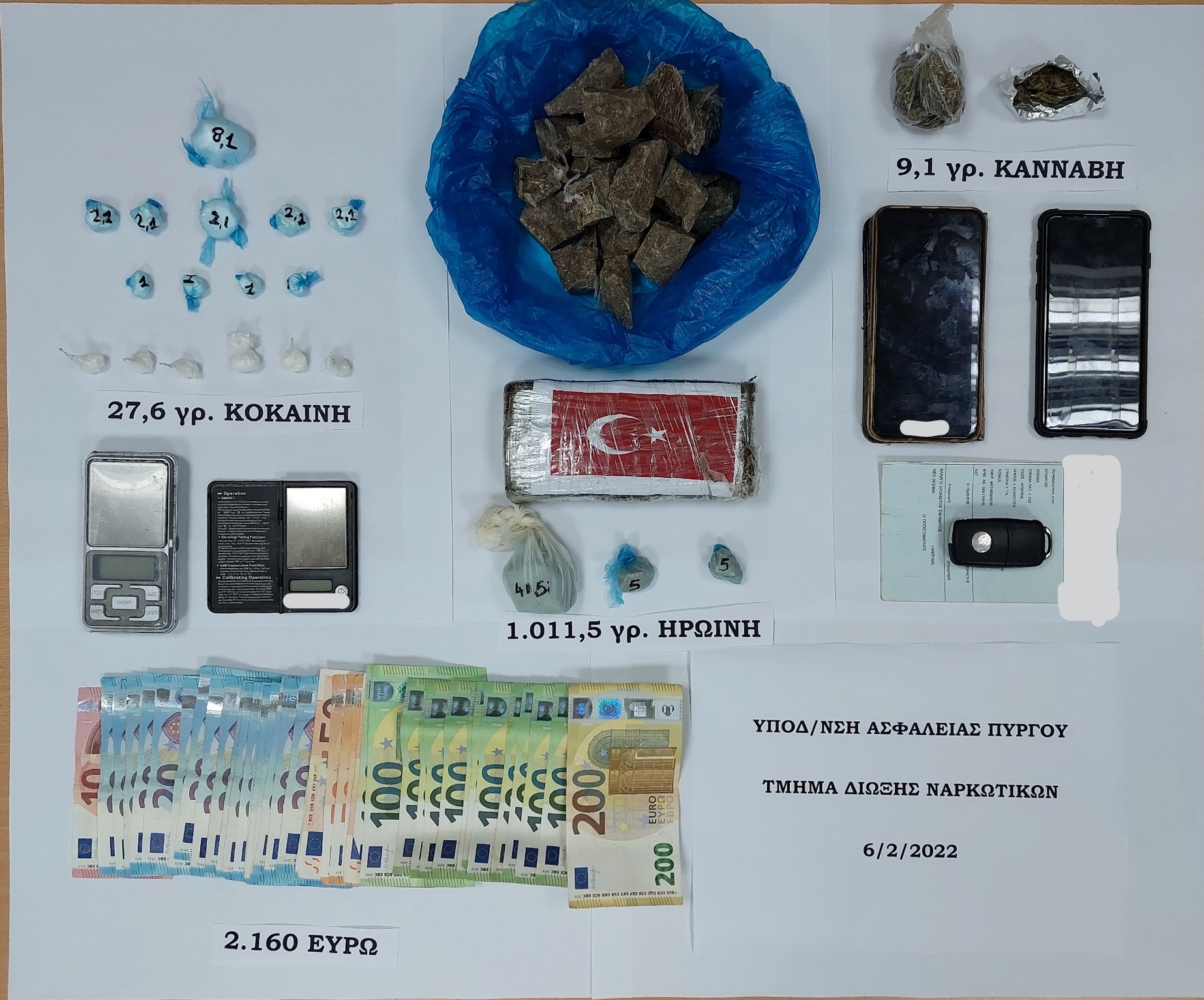 Συνελήφθησαν διακινητές ναρκωτικών στον Πύργο κάτοχοι  μεγάλης ποσότητας ναρκωτικών Κατασχέθηκαν περισσότερο από ένα κιλό ηρωίνης, (28) γραμμάρια κοκαΐνης και (2.160) ευρώ