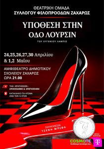 Η Θεατρική Ομάδα του Συλλόγου Φιλοπροόδων Ζαχάρως ανεβάζει τη θεατρική παράσταση «Υπόθεση στην οδό Λουρσίν» του Ευγένιου Λαμπίς σε σκηνοθεσία Τζένης Μπίθα στις 24, 25,26,27,30 Απριλίου & 1,2 Μαΐου και ώρα 21.00 στο Αμφιθέατρο του Δημοτικού Σχολείου Ζαχάρως.