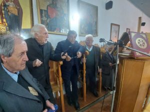 Ο μικρός ναός του Αγίου Γεωργίου Κάπελης γέμισε κάποια στιγμή από τον κόσμο. Σαν μια μυσταγωγία, σα να μπαινόβγαινε μες στο ναό ένα περιστέρι της μνήμης, σα να άκουγες τον αχό των Αγωνιστών και την κλαγγή των όπλων κα στο ψαλτήρι ώρες πολλές ο κ. Ρέγκλης ο πρεσβύτερος και ο κ. Ρέγκλης ο νεότερος… Παραδίπλα είχε έρθει από τον Πύργο ο κ. Χάρης Σομπότης, πρώην Σχολικός Σύμβουλος της Πρωτοβάθμιας Εκπαίδευσης Ηλείας, ο οποίος ανέγνωσε με στεντόρεια τη φωνή τον Απόστολο και είπε επίσης και το <<πιστεύω>>.