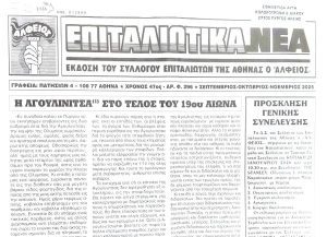 Η ΤΡΙΜΗΝΙΑΙΑ ΕΦΗΜΕΡΙΔΑ *ΕΠΙΤΑΛΙΩΤΙΚΑ ΝΕΑ* ΤΟΥ ΣΥΛΛΟΓΟΥ ΕΠΙΤΑΛΙΩΤΩΝ ΤΗΣ ΑΘΗΝΑΣ Ο *ΑΛΦΕΙΟΣ*