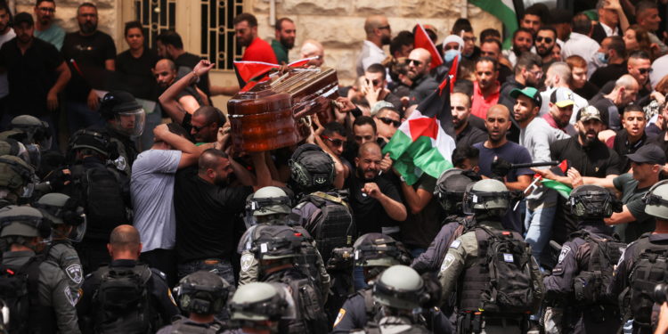 Πλάνα που ήρθαν στην δημοσιότητα από διάφορα διεθνή μέσα ενημέρωσης δείχνουν το φέρετρο της δημοσιογράφου του Αλ Τζαζίρα, που σκοτώθηκε προχθές Τετάρτη στη διάρκεια μιας ισραηλινής επιδρομής στη Δυτική Όχθη, να κινδυνεύει να πέσει στο έδαφος ενώ Ισραηλινοί αστυνομικοί διαλύουν το πλήθος.