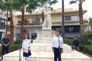 Στην πρώτη κατά σειρά τελετή του Δήμου, την παραμονή της εθνικής επετείου, συμμετείχαν οι σημαιοφόροι και οι παραστάτες όλων των σχολείων της περιοχής, οι οποίοι θα λάβουν μέρος και στη μεγάλη μαθητική παρέλαση της 28ης Οκτωβρίου.