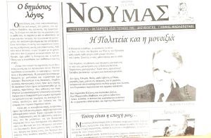 Σήμερα θα κάνουμε την παρουσίαση πιο αναλυτική και θα συγχαρούμε τον διευθυντή του <<Νουμά>> γι΄αυτή την συγκροτημένη έκδοση, με ένα εξαιρετικό πρωτοσέλιδο κείμενο, που επέχει τρόπον τινά θέση επιφυλλίδας, με τον τίτλο <<Ο δημόσιος λόγος>>.