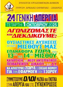 Ο Σύλλογος Εργαζομένων Δήμων Πύργου-Αρχαίας Ολυμπίας-Ζαχάρως συμμετέχει στην 24ωρη Γενική Πανελλαδική Απεργία που προκήρυξε η Α.Δ.Ε.Δ.Υ. για την ΤΕΤΑΡΤΗ 1η ΟΚΤΩΒΡΙΟΥ 2025 και καλεί όλους τους εργαζόμενους στους Ο.Τ.Α. Α΄ Βαθμού να λάβουν μέρος δυναμικά, ενωτικά και μαζικά στην Απεργία, αλλά και να δώσουν το αγωνιστικό «παρών» στη Συγκέντρωση Διαμαρτυρίας που θα πραγματοποιηθεί στις 11:00 το πρωί της ίδιας ημέρας στην Κεντρική Πλατεία Πύργου .